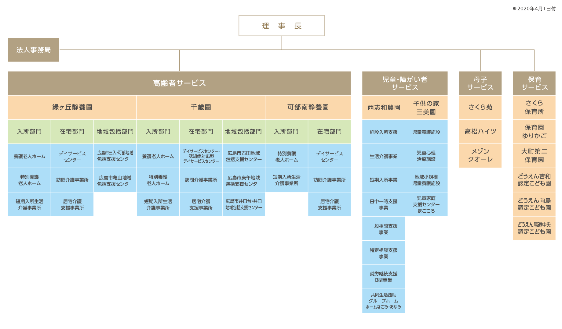| 2011.4 | 吉和保育園(現どうえん吉和認定こども園) 事業開始 子供の家三美園 児童家庭支援センターまごころ 事業開始 |