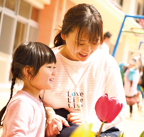 どうえん尾道中央認定こども園では、子どもと保育教諭は名前で呼び合います。「ひとりの人格を備えた子ども」と「ひとりの個性を持った保育教諭」として向き合い尊重することで信頼関係を築き、子ども一人ひとりの自己肯定感を高め主体性を育みます。そして、保護者の方に寄り添い、「子育てのパートナー」として認められることで、いつでも気軽に声がかけられ、どんな小さなことでも相談できる存在として、積極的にサポートします。