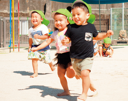 子どもたちは、友だちや保育士、隣接する広島市立大町幼稚園の4・5歳の子どもたちと一緒に「遊ぶ」ことで、楽しさを知りお互いに共感します。そこでは、豊かな感受性や思いやりの心が育まれ、気持ちを伝える言葉への興味が生まれます。園庭や砂場では、裸足※で自由に遊ばせ基礎体力を培います。施設規模が小さく、保育士と子どもが深くかかわり合えるので、一人ひとりの気持ちや興味を大切にした、丁寧で細やかな保育を実践しています。(※4月から11月まで)